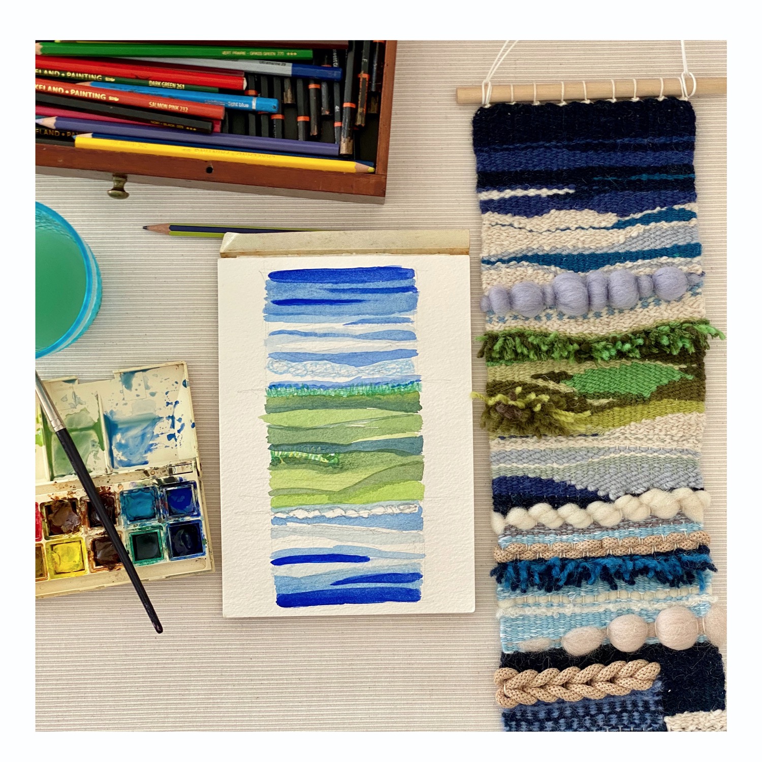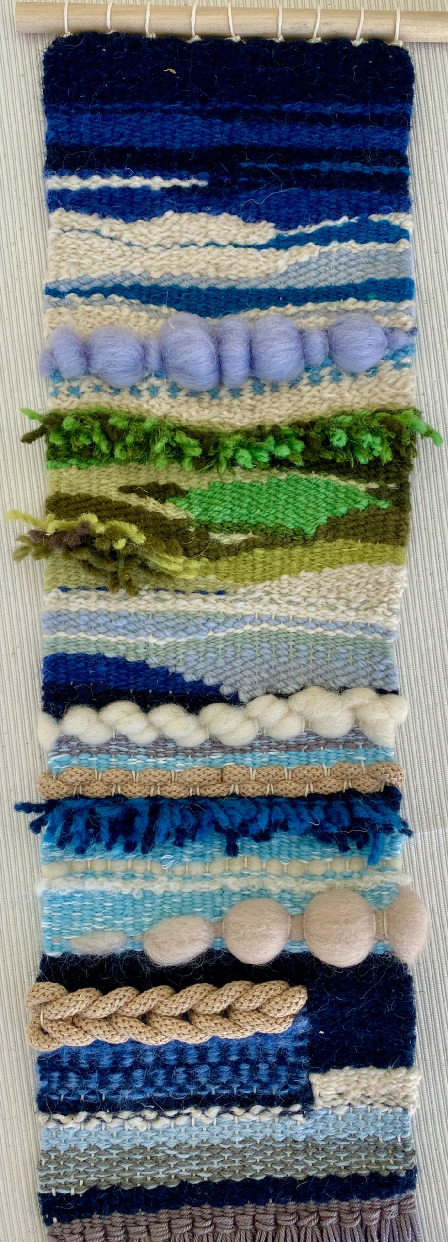 Recycled Fabric and wool on a wooden dowel.